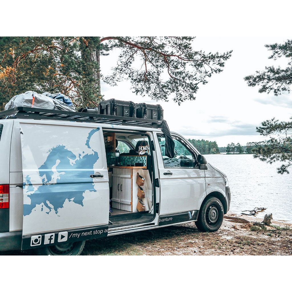 This 2570mm/101.2" long full-size Slimline II cargo roof rack kit contains the Slimline II Tray, Wind Deflector and 2 Foot Rails to mount the Slimline II Tray to your Volkswagen T5/T6 Transporter SWB. It easily installs using the existing factory mounting points. No drilling required.