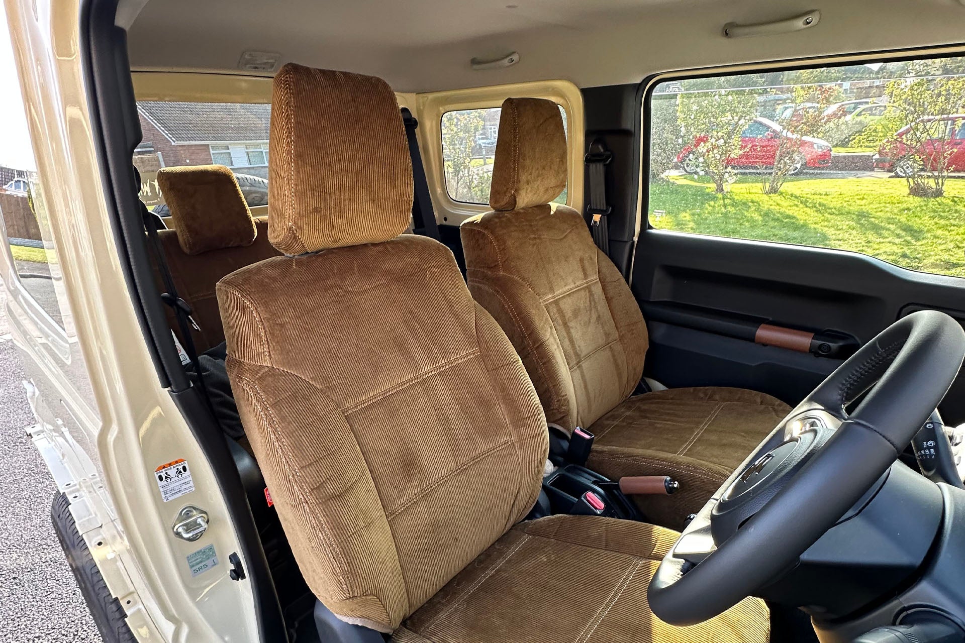 Manufactured from flame-retardant and water-repellent corduroy in a mocha brown colour, this APIO Seat Cover Set will transform the interior of your Jimny.